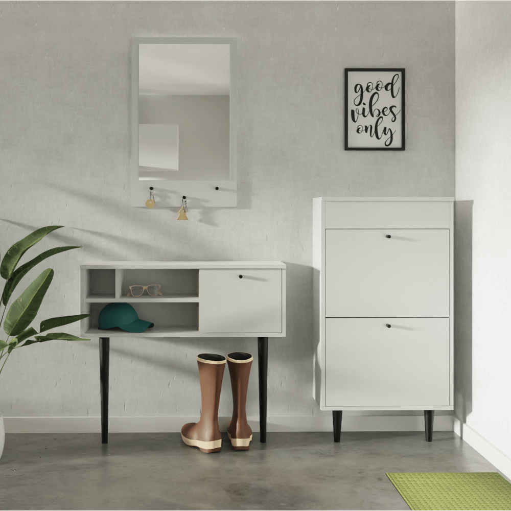 Pantofar din ansamblul de unităţi pentru hol SPACE. Corp alb, feţele frontale din MDF alb extra lucios HG. Dimensiuni (lxhxA): 80x43x40 cm